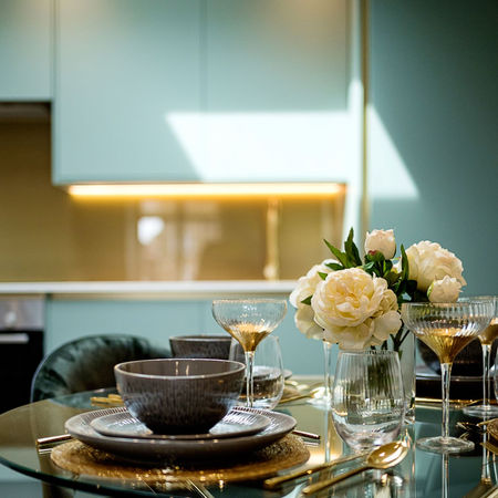 We based the design concept on tranquil sage greens and calming greys with pops of gold for a complimenting contrast. Mango wood furniture with brass finishes, marble top coffee and side tables and gold accessories throughout, gave testament to our commitment to bring in a touch of luxury to every design. Textured cushions and fabrics, scented candles and diffusers added the final touches to styling the apartment so it is move in ready.